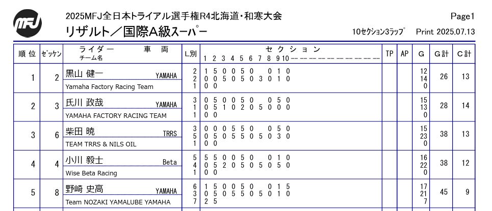 2025 MFJ全日本トライアル選手権シリーズ 第4戦 北海道大会 7月13日(日)わっさむサーキット(北海道) By shibata-tr投稿日: 2025-07-202025-08-03 毎年北海道大会はいい成績を出せるのですが、久々の表彰台を確保しました。1ラップ目、他のIASが誰も走破できない第2セクションを唯一クリーンし、気持ちよくセクションをこなしていきました。本来クリーンセクションであるはずの第4セクションを落としてしまったため、2位にはなれませんでしたが、引き続き後半戦も優勝目指して頑張ります。